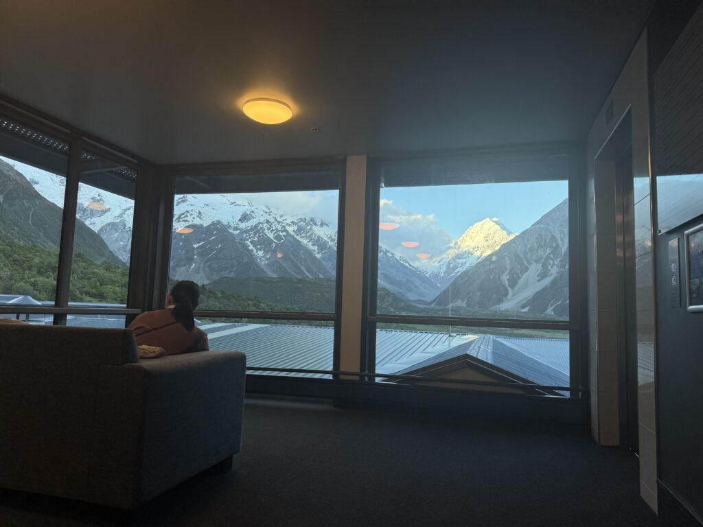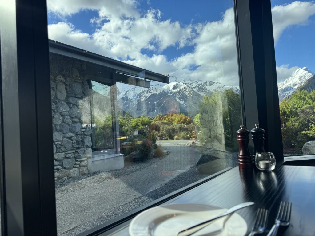 客室やレストランやカフェの窓からマウントクックが一望できる立地にあり、ホテル佇まいも落ち着いていて、お食事も美味しくて、さまざまなアクティビティに行くのに便利な場所にあり、長年予約のとりにくいホテルで有名だそうです。皆さん随分と前から予約をするとのこと。