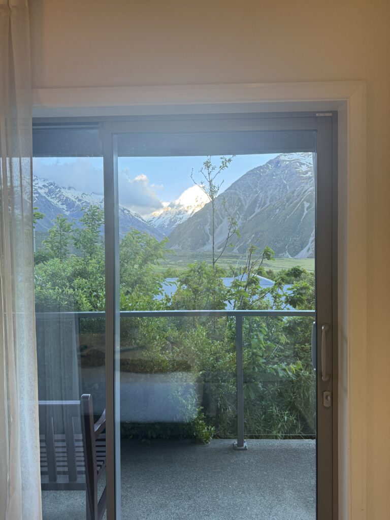 1)客室やホテルからマウントクックを一望でき、気持ちが良い